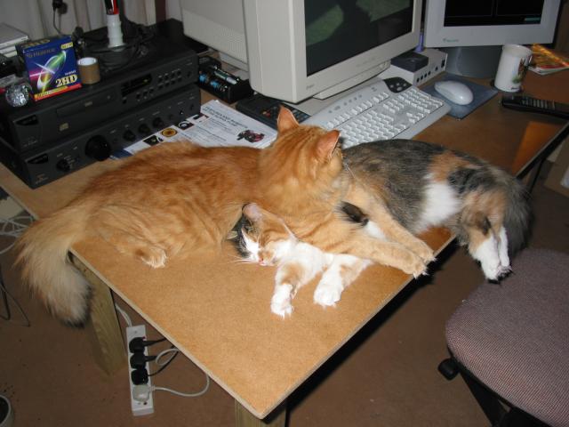 The cats like to sit by the keyboard so they can keep an eye on me.