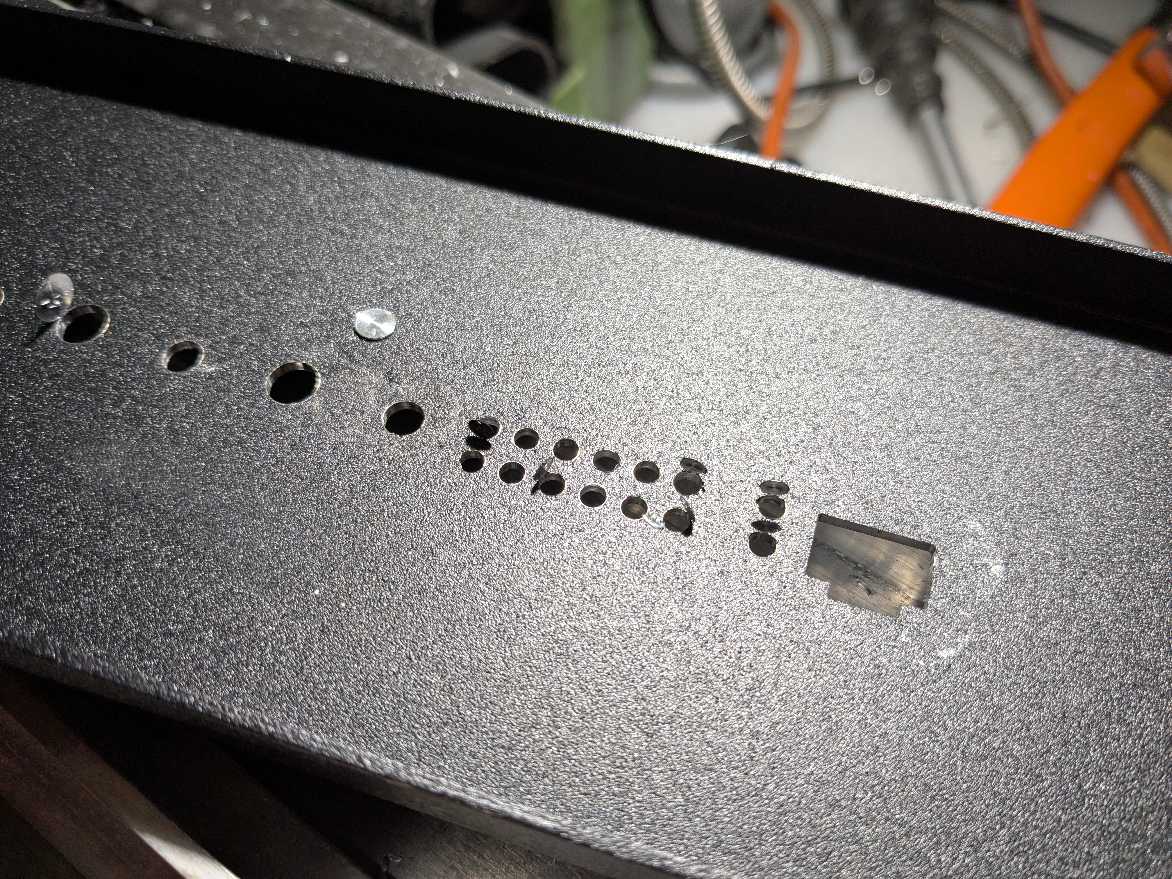 And the forty two small ones. I really like the flat-bottomed drills. They produce essentially no burr when breaking through, and these little disks can be removed with a fingernail.