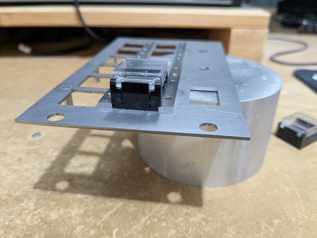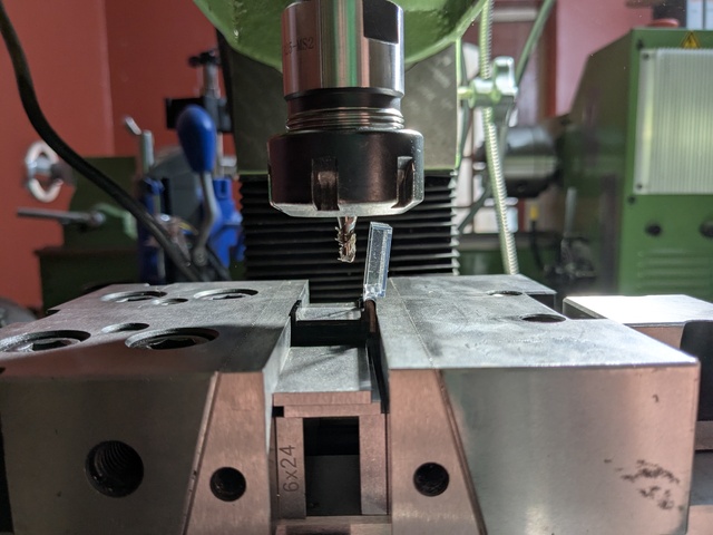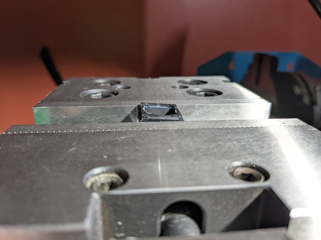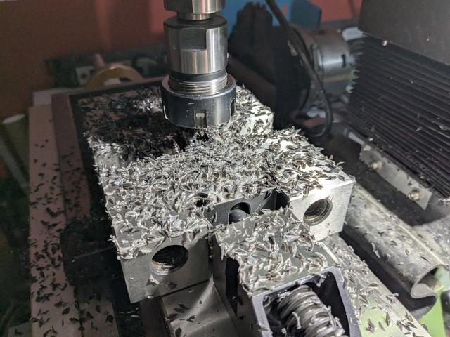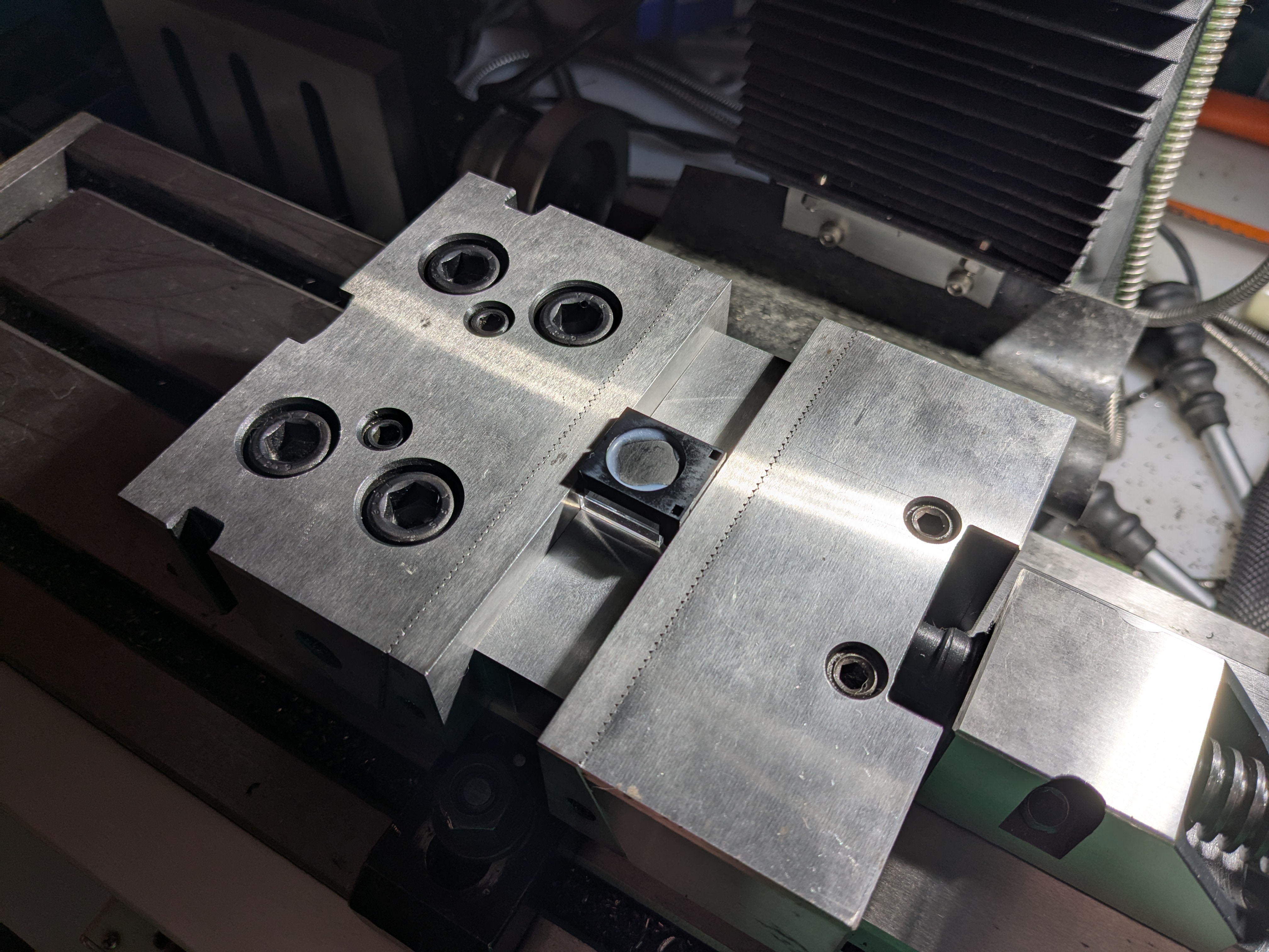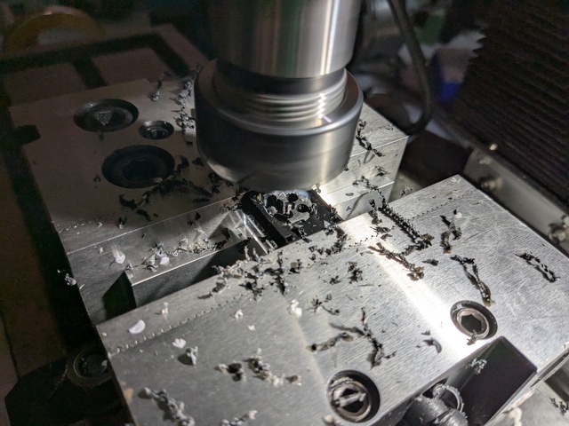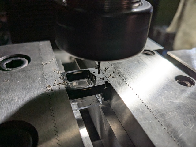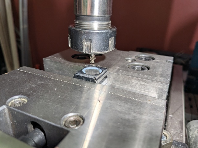 Now I need to make the square hole. I had hoped to clamp the cover this way up so the sides had some support from the parallels, but I can't get close enough to the flip-up cover.