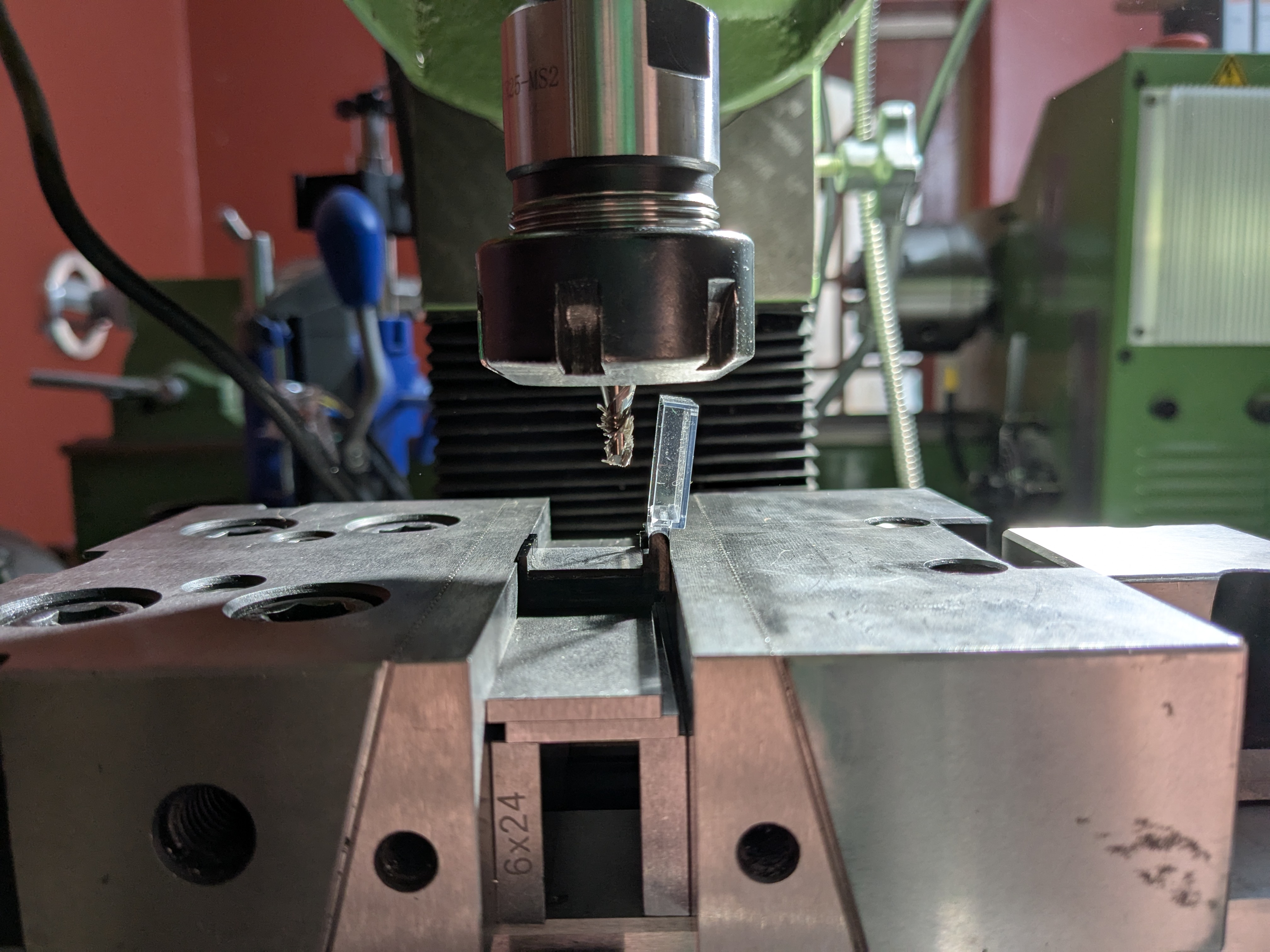 For the second part I removed the bulk of the material by drilling an array of holes, hoping that by making most of the force downward the part would be less likely to move in the vice.