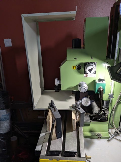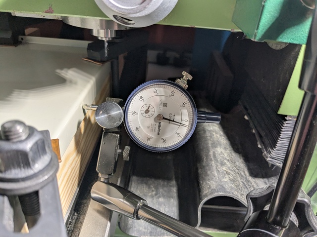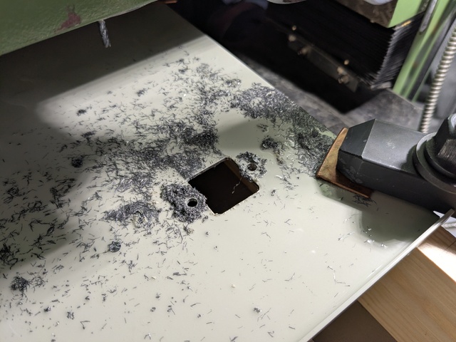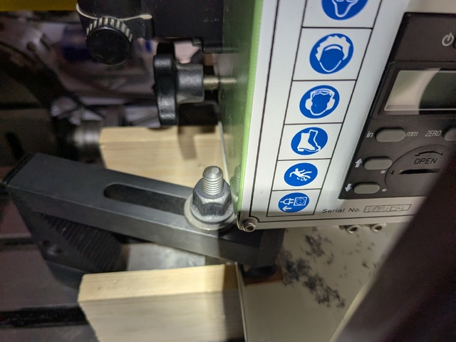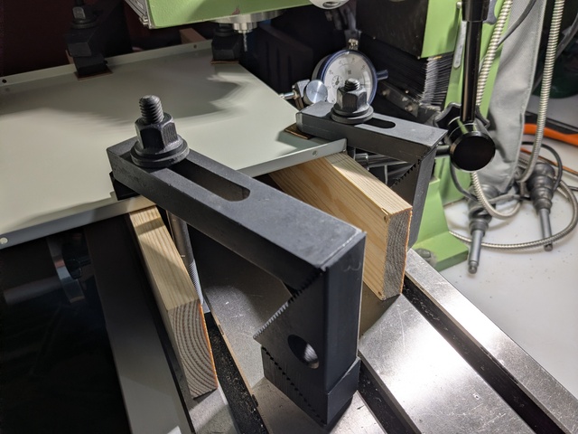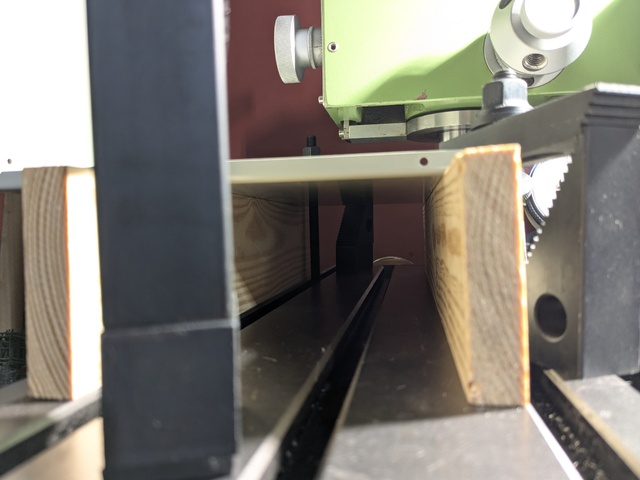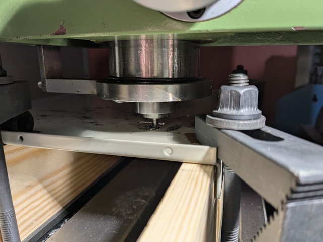 With the 4mm direct collet the head won't go low enough on the column to let the cutter reach the table, so I've had to raise the case a bit. I know this is a terrible setup, but it's a one-off.