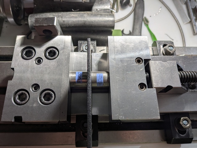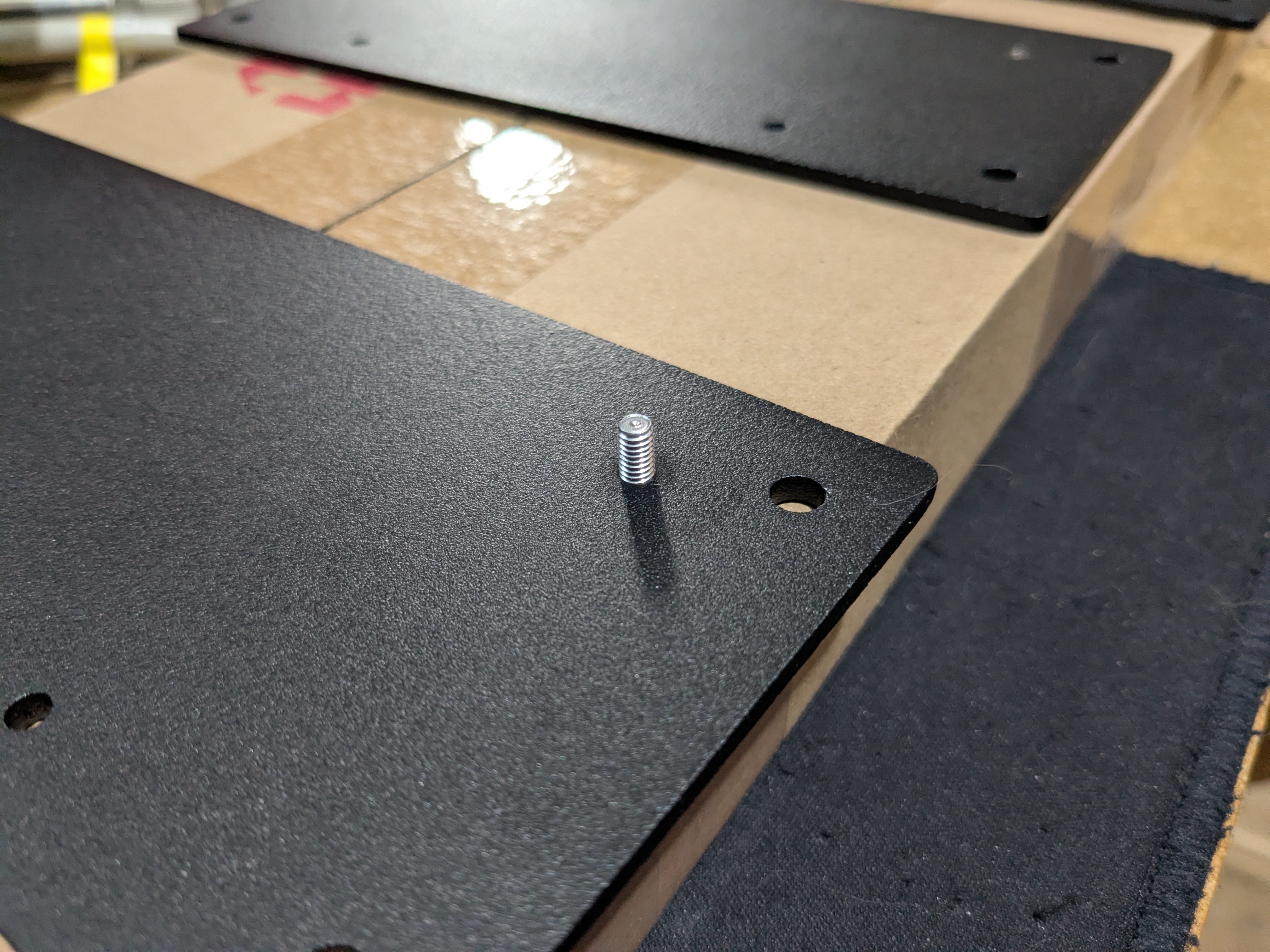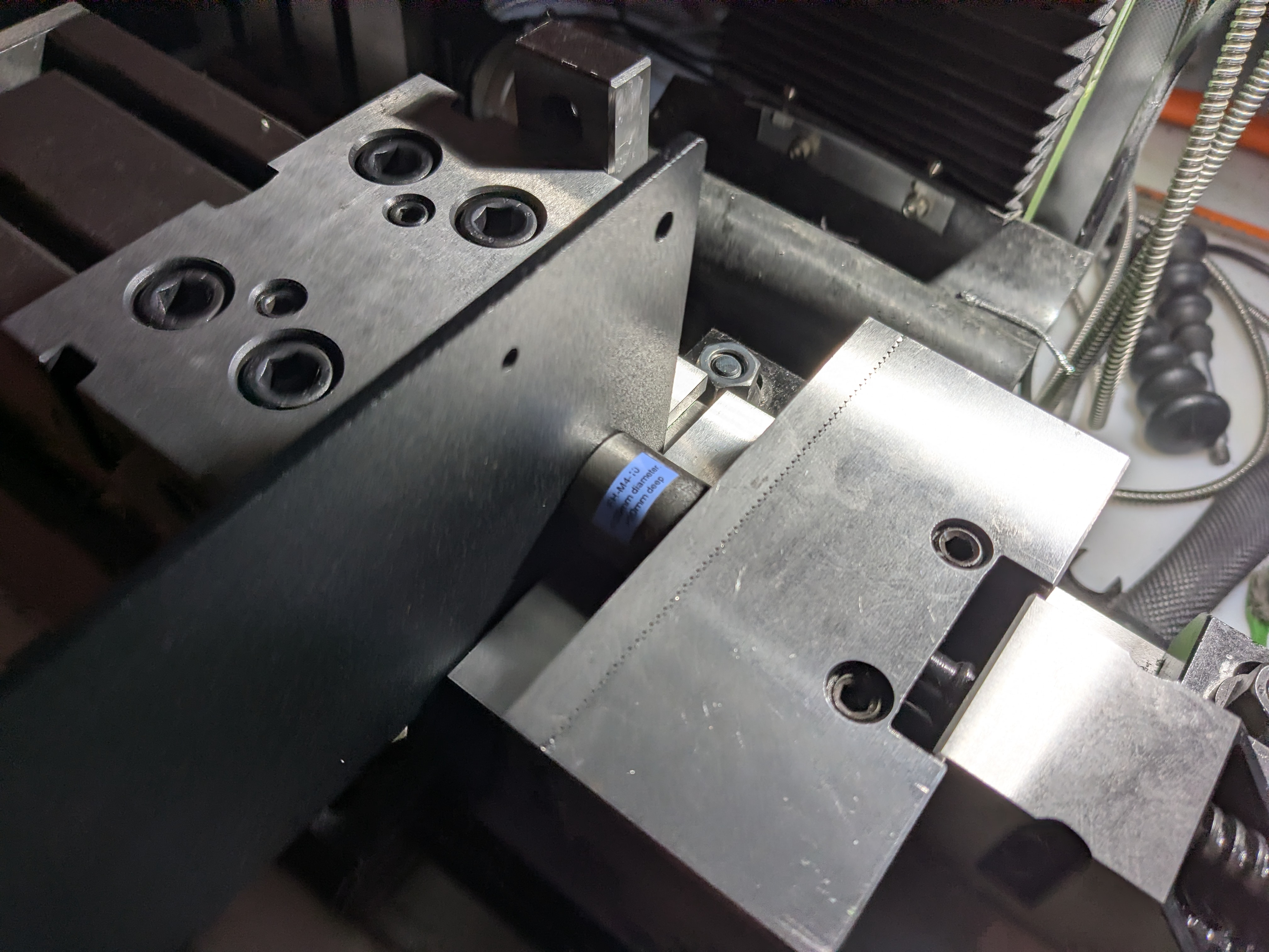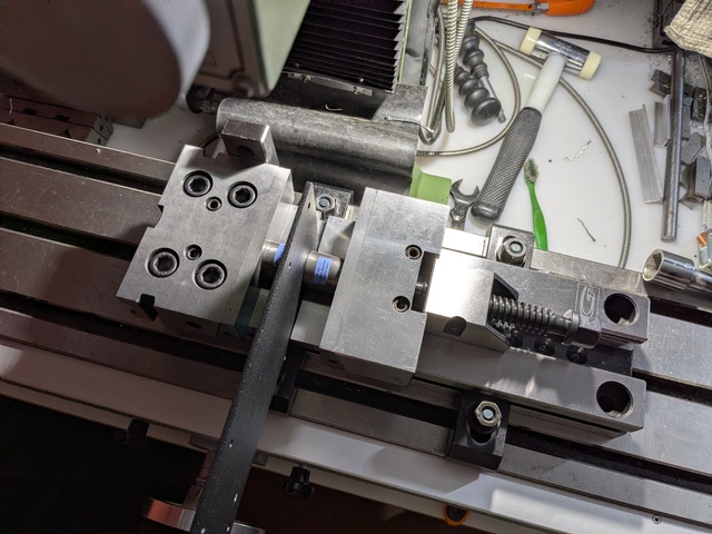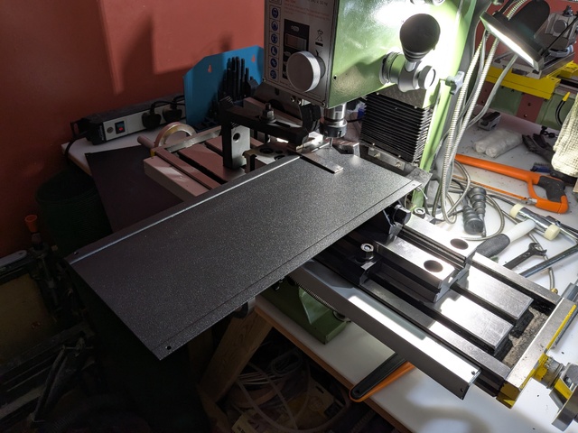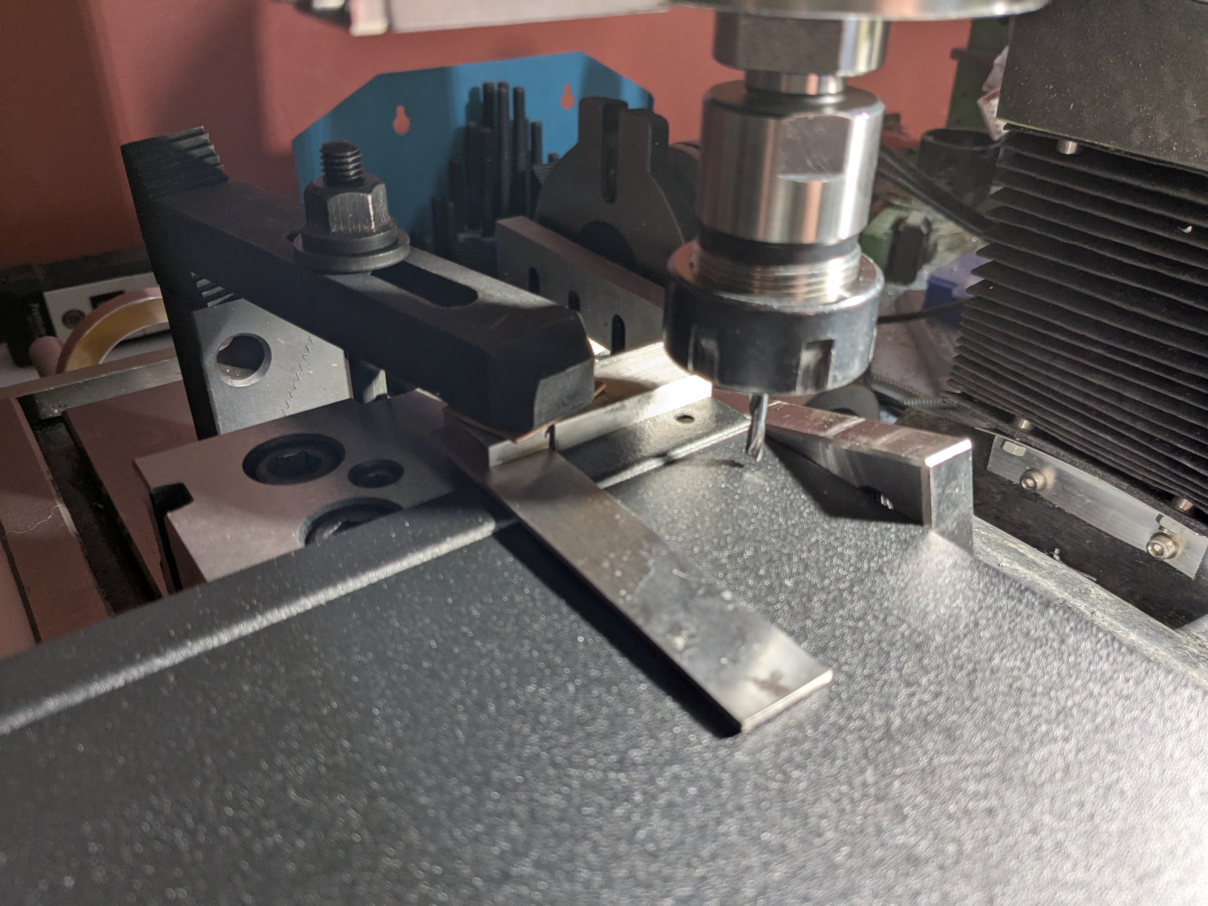 Not a brilliant setup, but it works well enough for drilling. The square is a cheap import that I wouldn't use for measuring but makes a great work stop. The blade doesn't hold anything, but does stop the panel from falling off the table when I let it go.